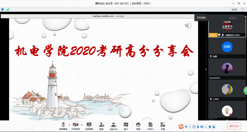 2020届考研高分分享交流会在腾讯会议中进行。参加本次会议的有张晖和薛鹏两位老师,特邀请2016级的今年考研高分的四位同学和部分研究生做考研经验分享,还有80余名大三、大二的同学聆听了本次大会。