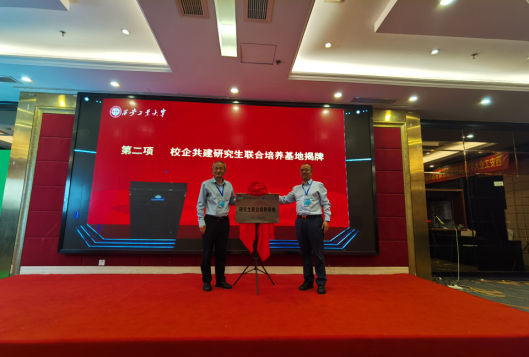 党委书记路金龙与南京欧晟电气有限公司总经理宋洪源共同签订了研究生联合培养基地协议,随后,副校长刘卜代表学校与南京欧晟电气有限公司董事长方巍共同为研究生联合培养基地揭牌。