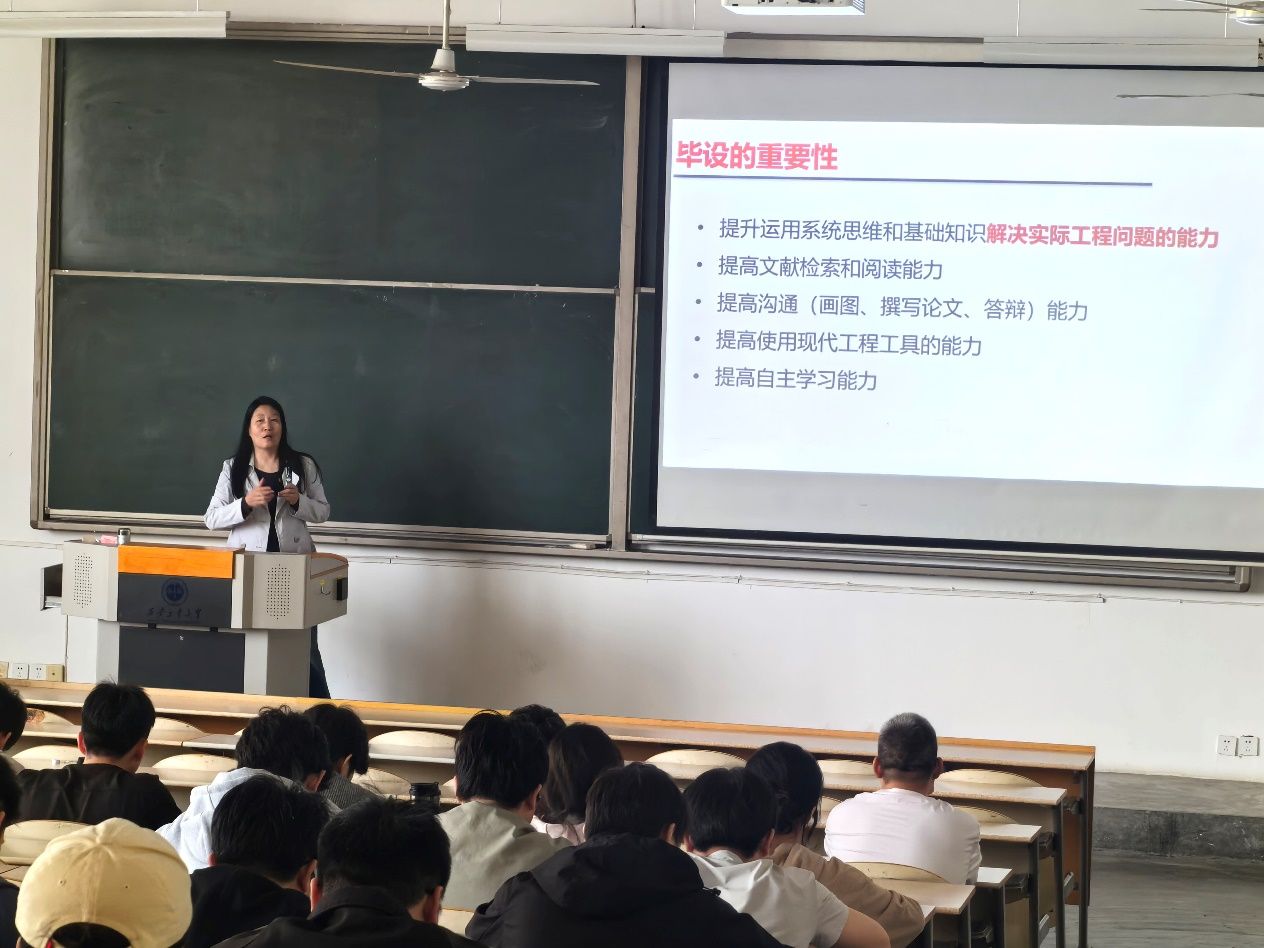 指导会上,蒋新广和彭润玲从毕业设计的意义和重要性切入,强调了毕业设计对培养学生解决工程问题能力的重要性。结合实例,详细讲解了如何通过文献综述明确研究方向,并分享了高效检索学术资源的技巧。并聚焦论文结构与写作规范,重点介绍了引言、方法论、结果分析等核心章节的撰写要点。此外,还通过案例分析,提醒学生避免常见写作误区,确保论文逻辑严谨、表达清晰。同时强调学术诚信的重要性,指出论文写作必须严格遵守学术规范,引用文献需注明出处,严禁任何形式的抄袭或数据造假。